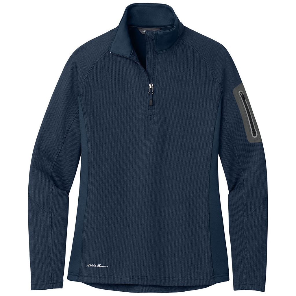 Performance is an underrated art in the world of the fleece jacket. Many people think it's for comfort; but comfort is easy. A jacket like this Eddie Bauer Women's River Blue Half Zip Performance Fleece Jacket goes above and beyond the realm of comfort and adds fashion versatility as well as durability and performance. Maybe that's due to the high-quality, lightweight poly/spandex blend that's every bit as comfortable as it looks all while accomplishing the feat of being much more durable than it appears. Why? Because jackets this good tend not to last. This one does. Add your custom embroidery onto it to make sure your corporate logo lasts just as long.