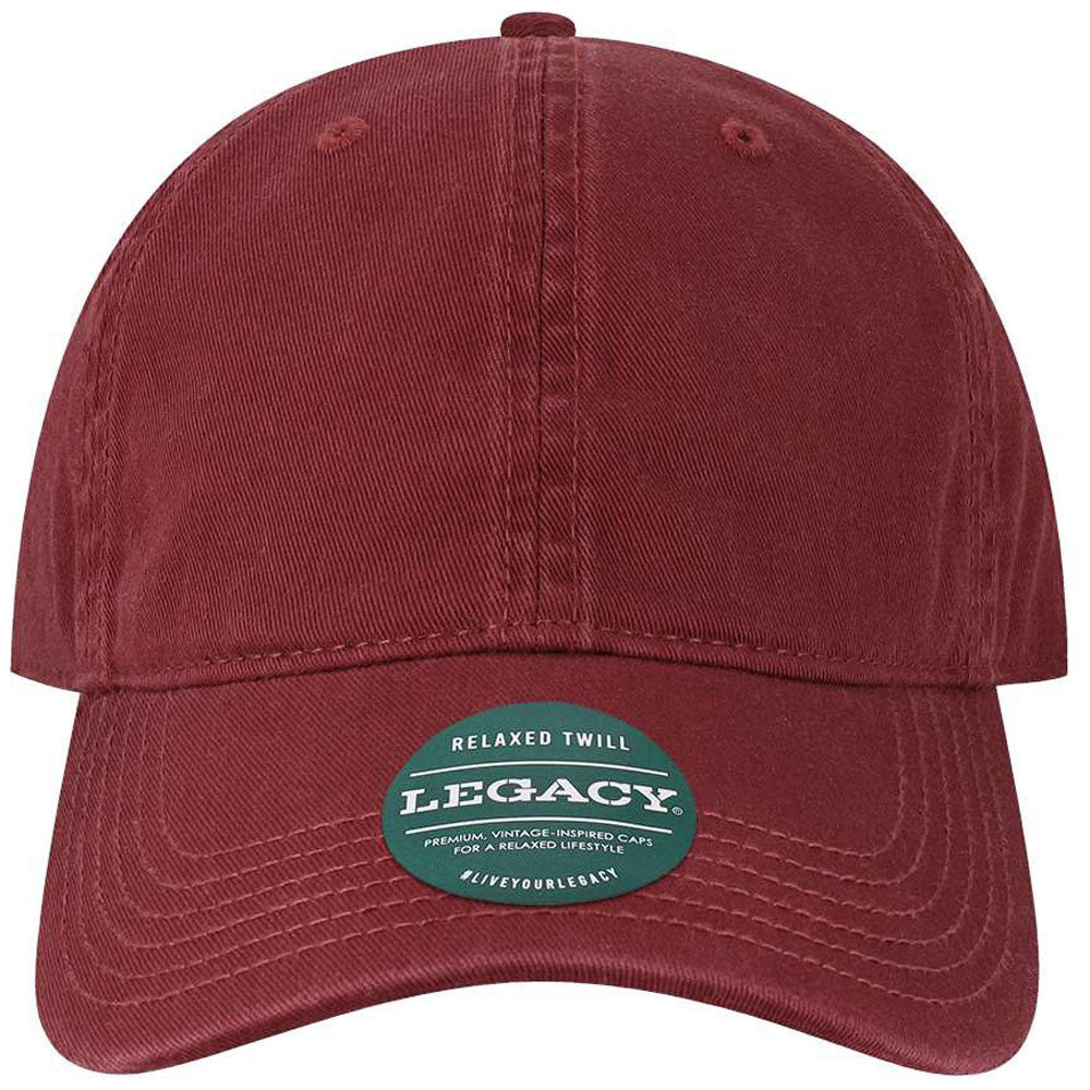 The Legacy Burgundy Relaxed Twill Dad Hat is a classic accessory with a vintage-inspired sense of style. Available in a range of classic color options, adding your company's custom logo or design to the front of this 6-panel hat will create a stylish promotional accessory that will look great while spreading the word about your brand.Highlights