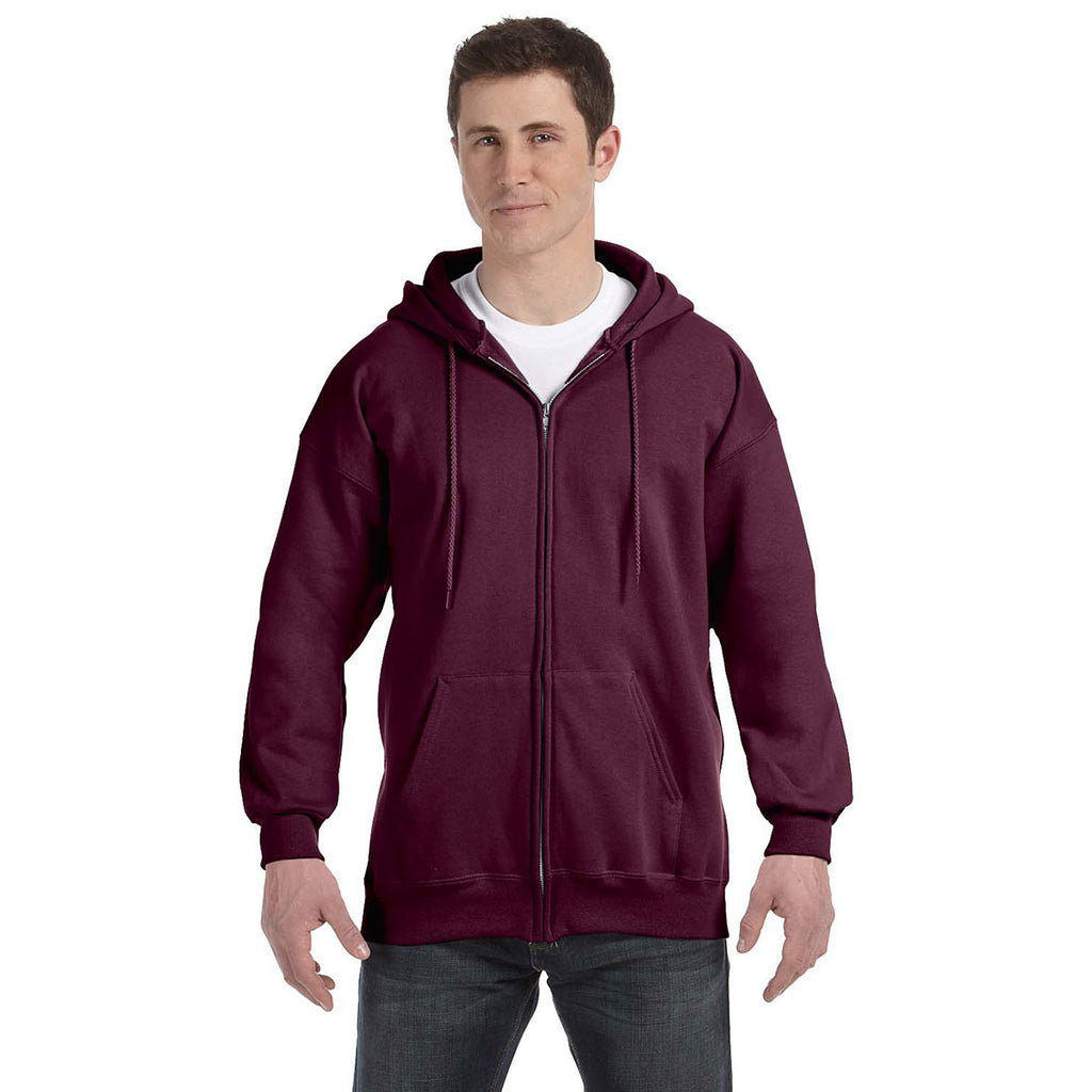Custom embroidery and functionality come together in the Hanes Men's Maroon 9.7 oz. Ultimate Cotton 90/10 Full-Zip Hood. Perfect as an addition to employee apparel for those who need to be outdoors or in cold environments, this full-zip hoodie offers roomy front pockets and jersey lined two-ply hood for comfort and protection. Use these as giveaways at the next trade show or recruiting event with a custom logo to help people remember your company or team. This piece offers the simple comfort that everyone will love, making it a go to piece for everything from a trip to the gym to the morning commute. Place your order today.Highlights