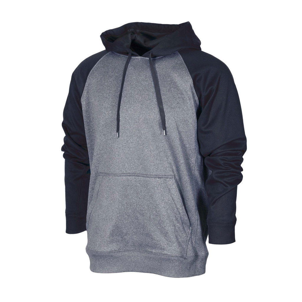Give a logoed fleece that men will really like to wear. This model might make them feel like Rocky Balboa plus with your company logo they will certainly feel like a winner! The BAW Men's Heather Black/Navy Raglan Sleeve Fleece Hooded is made from heathered polyester Thermo-Tek so it is truly cozy and comfortable. It is fully cover-seamed, and has a dyed to match draw cord. It features a front pouch pocket with hidden media pocket for convenience. Sizes available from S to 4X. The front and back are solid grey which will make your logo stand out better. The sleeves and hood are in contrasting colors.Highlights