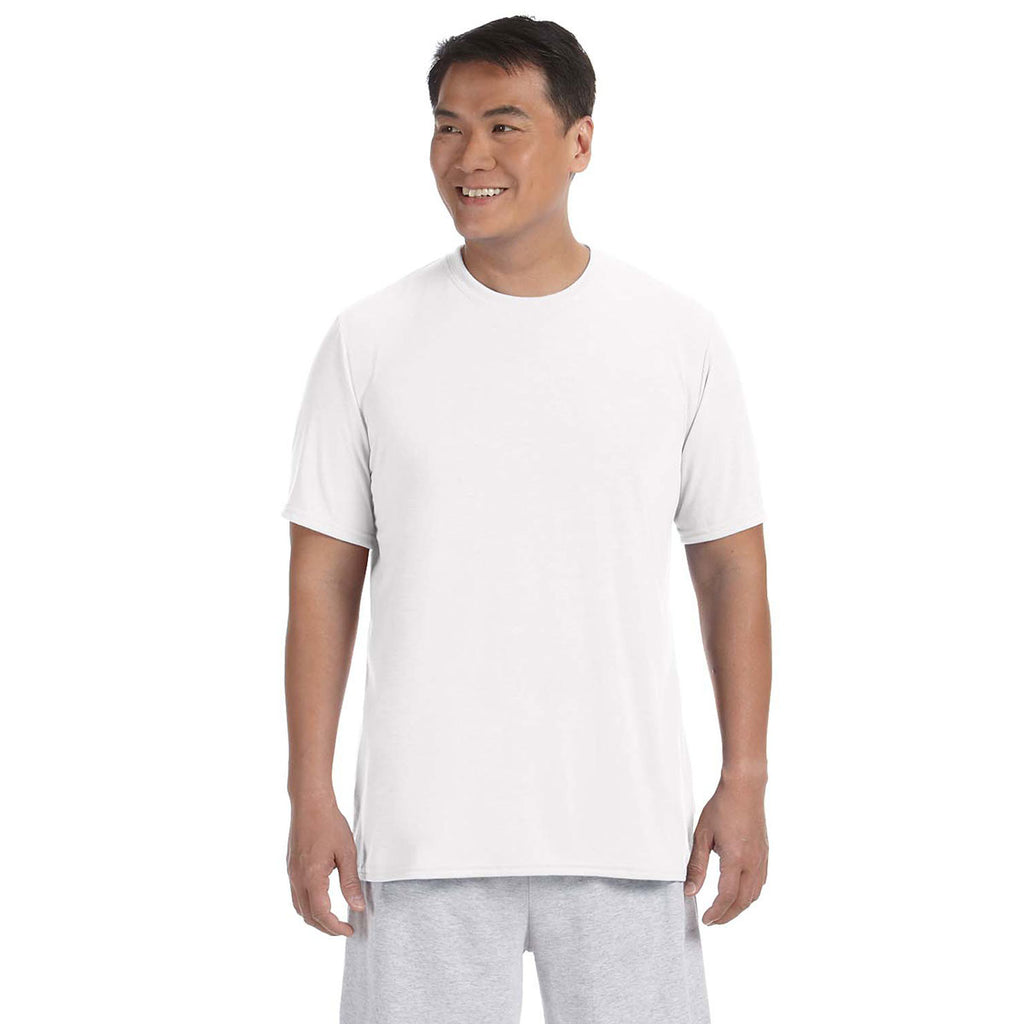 Take athletic performance to the next level by ordering the screen printed Gildan Men's White Performance T-Shirt for every employee on your high achieving team. Even the employees that prefer to root for the corporate softball team deserve to wear the lightweight, multi-purpose short sleeve shirts. Snag resistant fabric prevents the t-shirt from scrunching up whenever a player slides into second base. Designed with 100% polyester jersey knit, the stylish short sleeve shirt will get the other team talking about your incredible taste in fashion. Print a custom logo to take advantage of all the attention.Highlights