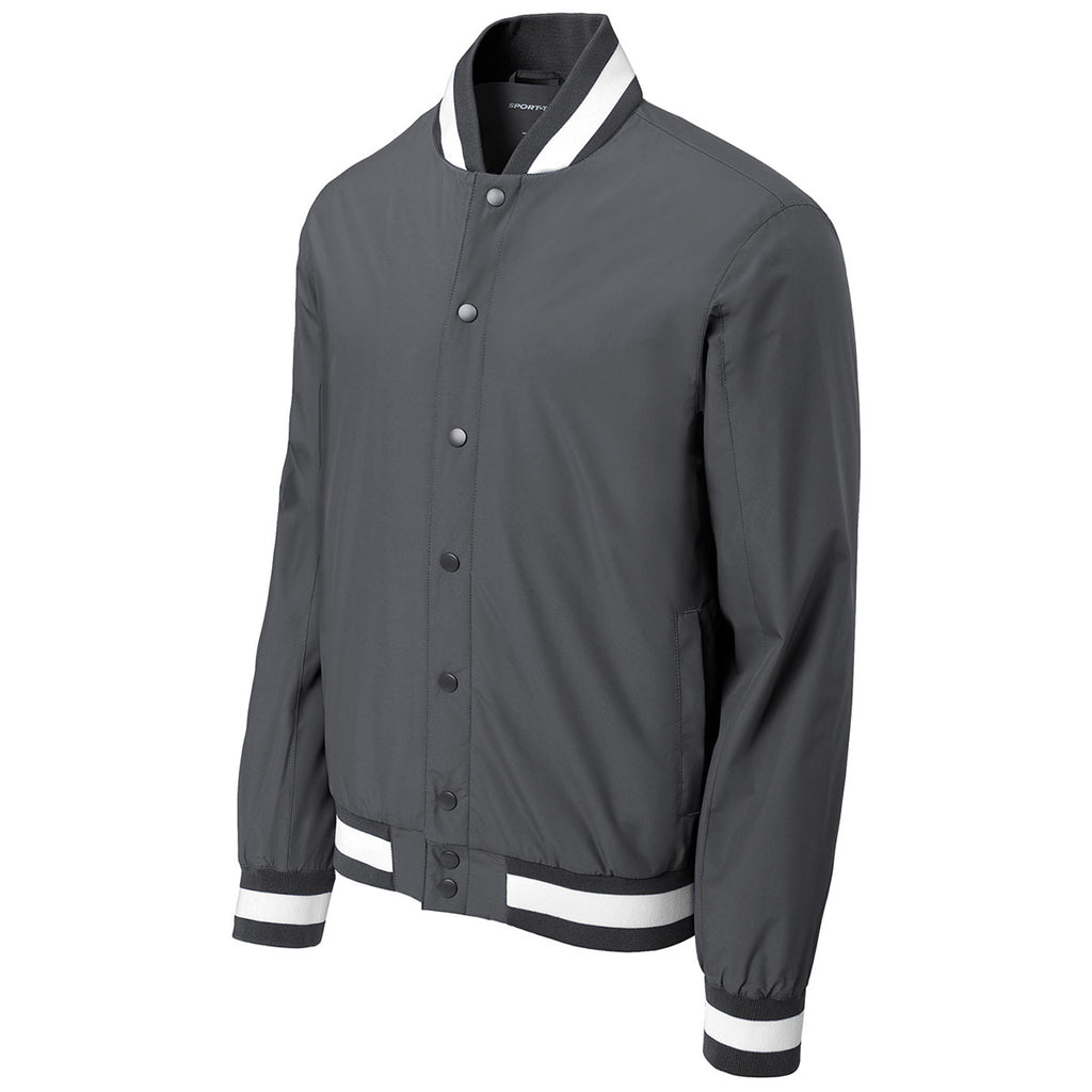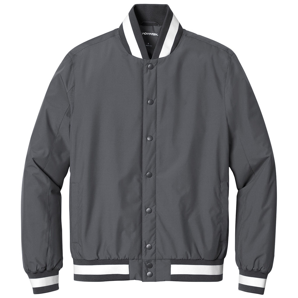 Sport-Tek Men's Graphite Insulated Varsity Jacket with a custom logo is a great gift for yourself or others. The snap-button jacket screams coach or team member. The water-resistant coating and tag-free design make this great as part of team gear or for those supporters attending the games. Place an order today.Highlights