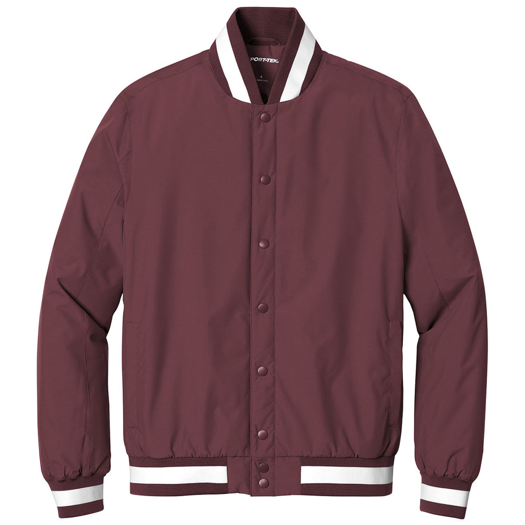 Sport-Tek Men's Maroon Insulated Varsity Jacket with a custom logo is a great gift for yourself or others. The snap-button jacket screams coach or team member. The water-resistant coating and tag-free design make this great as part of team gear or for those supporters attending the games. Place an order today.Highlights