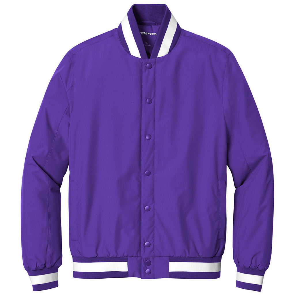 Sport-Tek Men's Purple Insulated Varsity Jacket with a custom logo is a great gift for yourself or others. The snap-button jacket screams coach or team member. The water-resistant coating and tag-free design make this great as part of team gear or for those supporters attending the games. Place an order today.Highlights