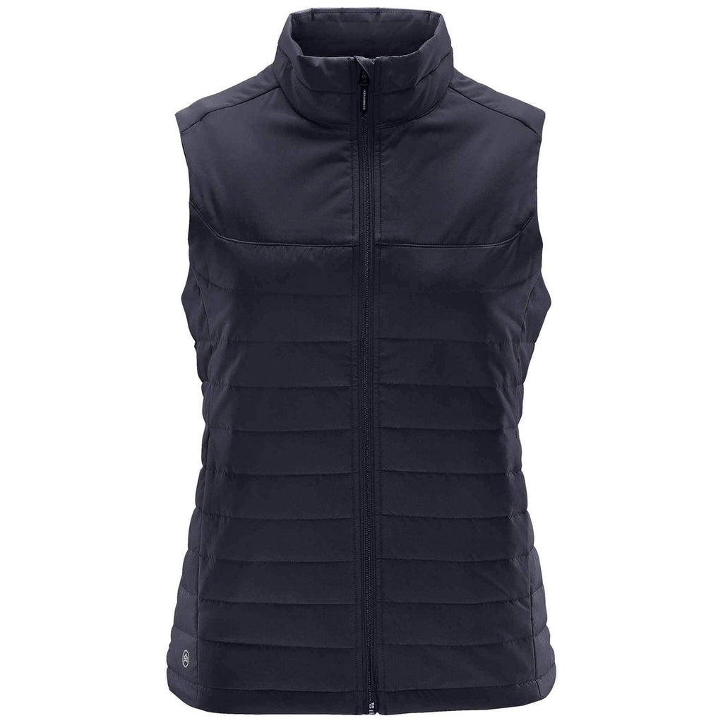 Long lasting thermal layering makes the custom logoed Stormtech Women's Navy Nautilus Quilted Vest the perfect winter jacket for outdoor enthusiasts that love to seek adventure during late fall and winter. The insulated layering traps body heat to ensure you remain comfortably warm on the coldest days. A lifted collar line does a great job of keeping the neck and lower face warm as well. Attach your company logo on the quilted jacket to attract more interest in what our brand has to offer. The rugged fabric resists the types of rips and tears that diminish the quality of other styles of winter jackets.Corresponding Men's Style: Stormtech Men's Navy Nautilus Quilted Vest