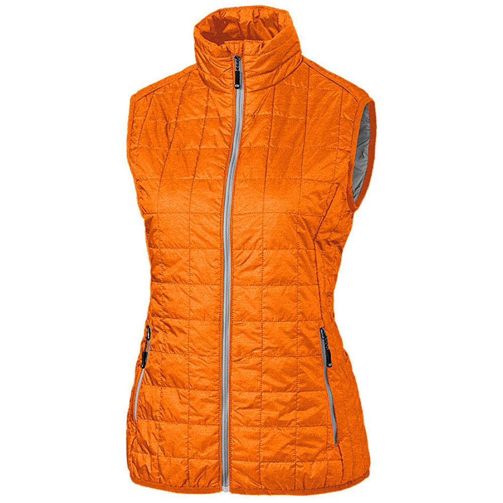 Quilted vests are in, and when you put your custom logo on this Cutter & Buck Women's Satsuma Rainier Vest, everyone will know you are a company that keeps up with the times. It is insulted and made from easy-care taffeta. It has a mock turtle neck, full zipper front and front pockets with zippers. The wind will be kept at bay with the elastic bound armholes and hem. For your embroidered logo there is zip in lining for embroidery access. There is Primaloft fill that is packable into the left front pocket. This vest is machine washable in cold water on the delicate cycle.Corresponding Men's Style:Cutter & Buck Men's Satsuma Rainier Vest