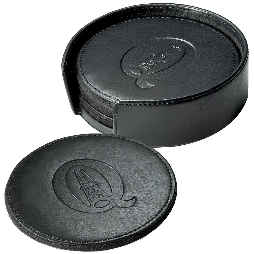 Recycled Cowhide bonded leather gives the Leeman Black Lincoln Center Round Coaster Set a dignified look that makes the coaster perfect for entertaining guests in your home or professional peers at the office. The handcrafted leather never stains because of prolonged exposure to moisture. Take advantage of the large Deboss imprint area to attach your corporate logo. The cost-effective marketing platform spreads the word about your company's strong reputation for delivering high-quality products and services. Leeman designed the coaster set to include a faux suede bottom to protect furniture. The faux suede bottom also ensures a stable coaster to steady full beverages.