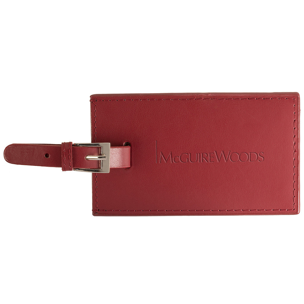 The minimum order for this product is 50 piecesWith an adjustable strap and silver-tone buckle, the Leeman Red Whitney Luggage Tag helps you retrieve your luggage quickly at airport baggage claims. Strong bonded leather resists the types of rips and tears that cause other luggage tags to disconnect from backpacks, suitcases, and duffel bags. Leeman has added a strap that secures the backside flap to prevent anyone from reading your personal information. The 2.75" wide by 2.25" long Deboss imprint area make the perfect spot to add your company logo. What better opportunity will you have to promote your brand than at busy airport terminals and concourses?