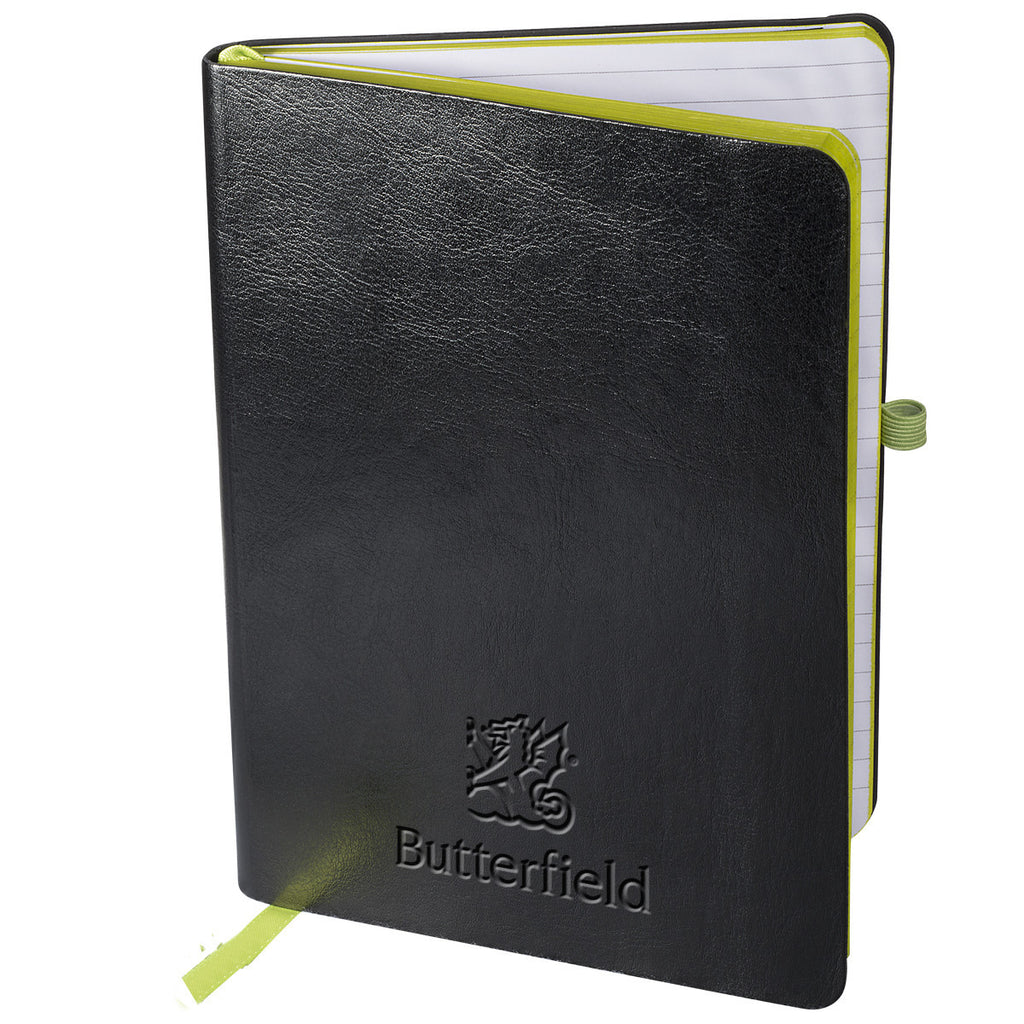 The minimum order for this product is 25 piecesThe Deboss imprint method used for the Leeman Black/Lime Green Venezia Journal helps elevate your marketing game. Measuring 2.5" wide by 1.5" tall, the large imprint area is centered on the bottom of the front cover. By attaching your corporate logo, you create a cost effective marketing tool that increases awareness of your company throughout the community. Ninety-six ruled pages provide plenty of writing space to prepare a lengthy business presentation. The elastic loop closure ensures the notes remain protected against beverage spills. Matching-colored edges complement the elegance presented by the super soft faux leather cover.