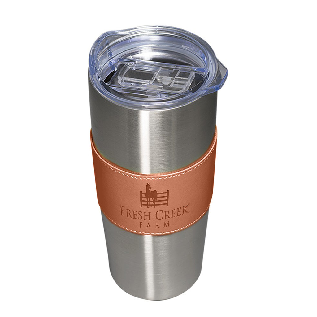- Vacuum insulated double-wall Stainless Steel tumbler with faux leather sleeve