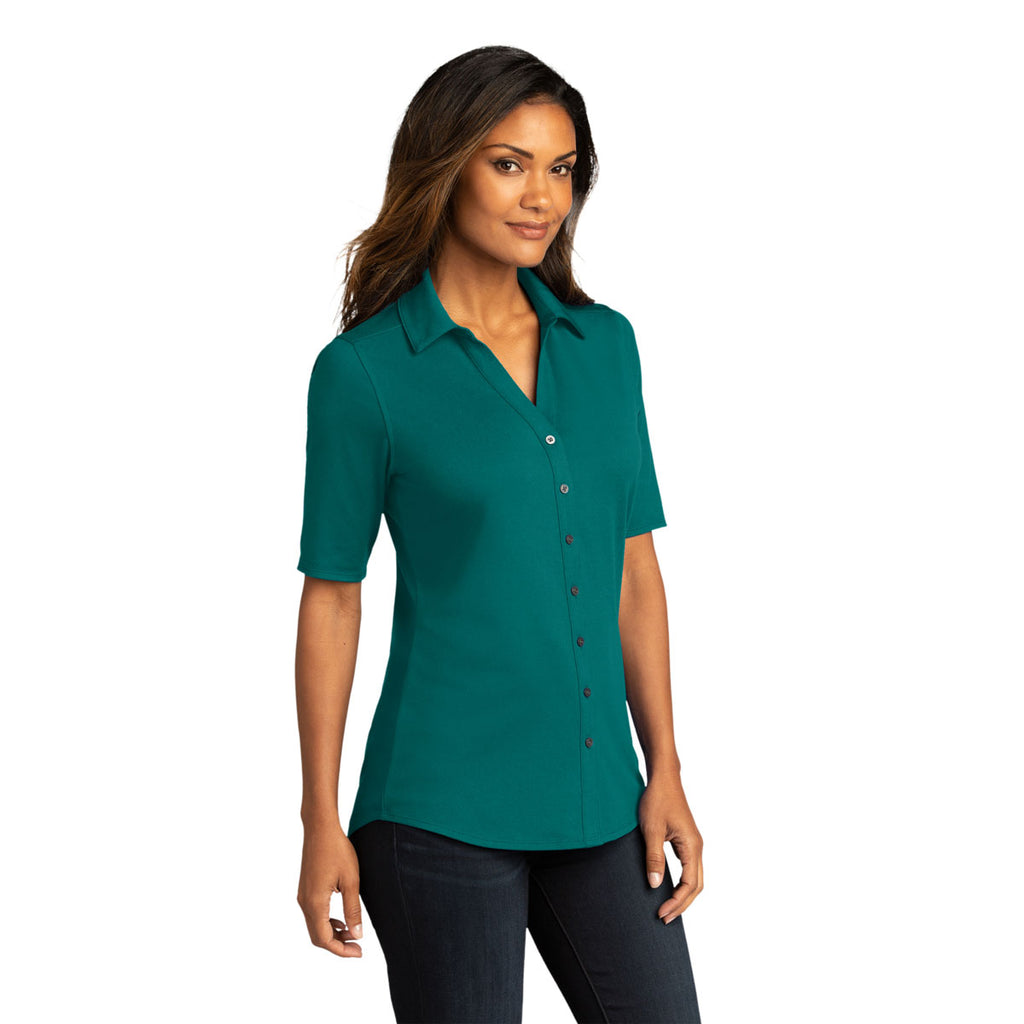 Add embroidery to the Port Authority Women's Dark Teal City Stretch Top to maintain a professional look that also performs under tough conditions. This poly spandex blend top is ready for work with moisture wicking, snag resistance, stretch, Easy Care, and odor resistance. The professional look of this stretch top means it can easily serve as a corporate uniform with a company logo. The Y-neck collar, full button placket with pearlized smoke buttons, and slightly curved hem with drop tail provides extra coverage. Though listed as short sleeve, they are longer to maintain professionalism.