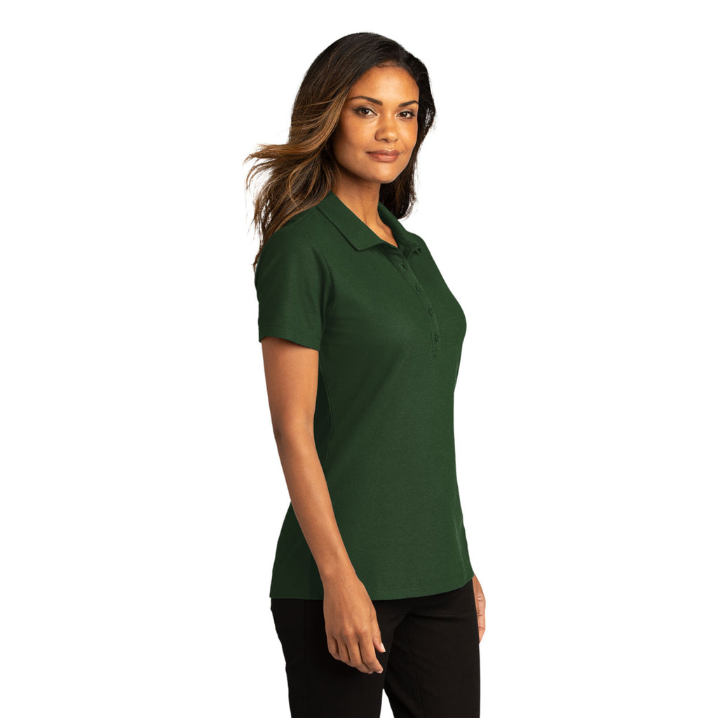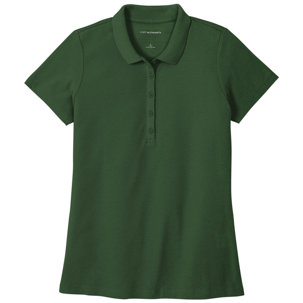 Design a custom embroidery for the Port Authority Women's Dark Green SuperPro React Polo for a look that can go from the office to dinner with friends with complete ease. This classic uniform style meets performance wear in this poly cotton polo that is ready for anything life can bring. Add a company logo to create a corporate uniform that is comfortable and convenient with stain release, snag resistance, and Easy Care qualities. The flat knit collar with five button placket makes this polo easy to layer or wear alone. Enjoy a day with friends, at work, or anywhere you please and look great while doing it.