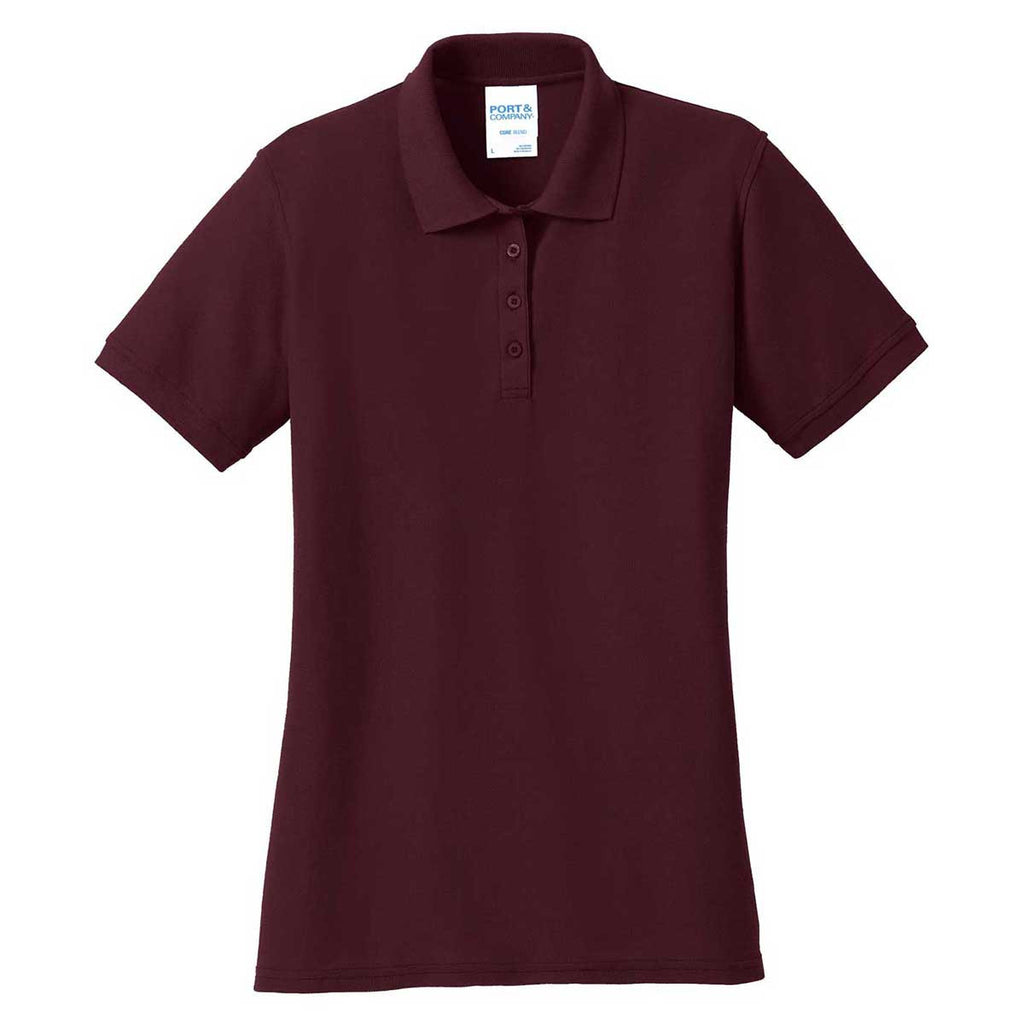 Crafted with a balanced cotton-polyester blend, this Port & Company Women's Athletic Maroon Core Blend Pique Polo brims with classic appeal. A comfortable contoured fit with side seams makes it the perfect option for a girl on the move. Timeless polo details like button placket, dyed-to-match buttons, ribbed collar and cuffs bring sweet appeal and day-long comfort. It features double-needle stitching for durability. Treated with Soil Release finish for easy cleanups. Easily personalize this Port & Company Women's Athletic Maroon Core Blend Pique Polo with your company's logo or motto for use as employee work wear or distributing as corporate promotional merchandise which will unleash a lasting brand awareness campaign.Highlights