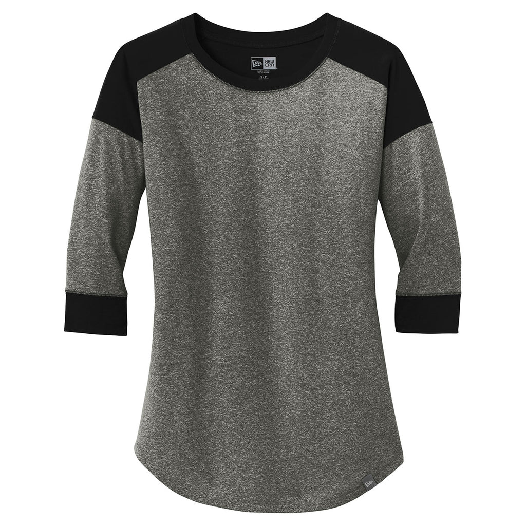 Class heritage styles heavily influences the appearance of stylish custom logoed New Era Women's BlackBlackTwistist Heritage Blend 3/4 Sleeve Baseball Raglan Tee. With a scalloped hem and shoulder and back yoke color blocking the all-purpose tee is a fashion hit during business trips. Attach your corporate logo to let everyone know your company stands for delivering high-quality products. Cotton brings to the fashion table supreme comfort, while blended polyester resists rips and tears to give you a go to tee for all occasions. Raglan sleeves create more arm motion, which helps you reach difficult to access areas of your property.
