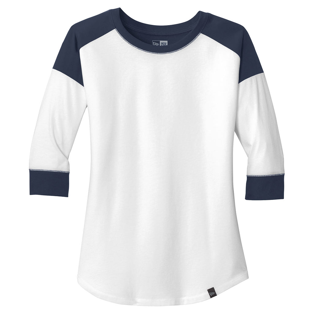 Class heritage styles heavily influences the appearance of stylish custom logoed New Era Women's True Navy/White Heritage Blend 3/4 Sleeve Baseball Raglan Tee. With a scalloped hem and shoulder and back yoke color blocking the all-purpose tee is a fashion hit during business trips. Attach your corporate logo to let everyone know your company stands for delivering high-quality products. Cotton brings to the fashion table supreme comfort, while blended polyester resists rips and tears to give you a go to tee for all occasions. Raglan sleeves create more arm motion, which helps you reach difficult to access areas of your property.