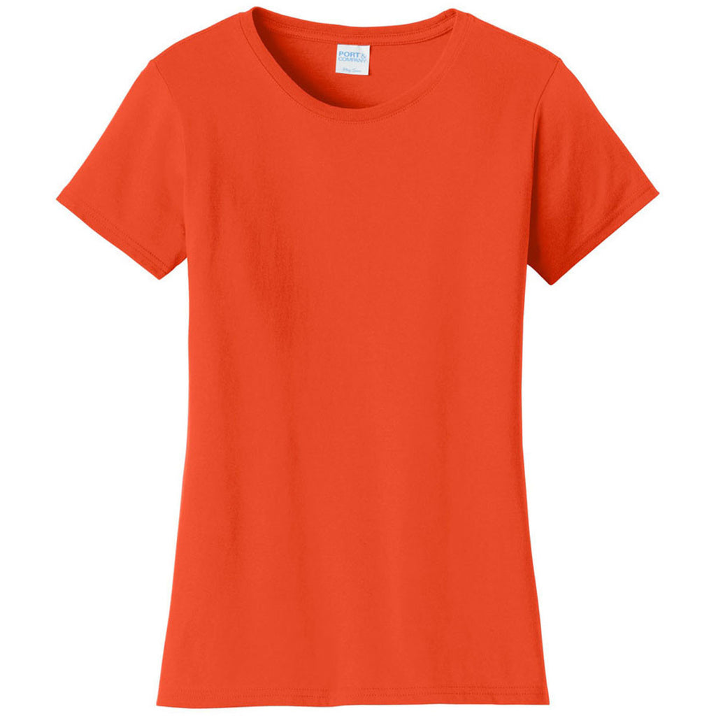 Do moisture laden t-shirts bog you down whenever you need to ramp up the competitive juices? Port & Company Women's Orange Fan Favorite Tee contain moisture wicking technology that quickly evaporates perspiration the instant it forms on your skin. The result is a cooling of the skin that invigorates your body. Set-in sleeves allow for more arm movement, which comes in handy on the golf course and tennis court. The super soft fabric endures countless wash and dry cycles, without any of the colors fading. One-hundred percent rugged polyester interlock resists rips and tears. Attach your company logo to the t-shirts to spread the word about your brand.
