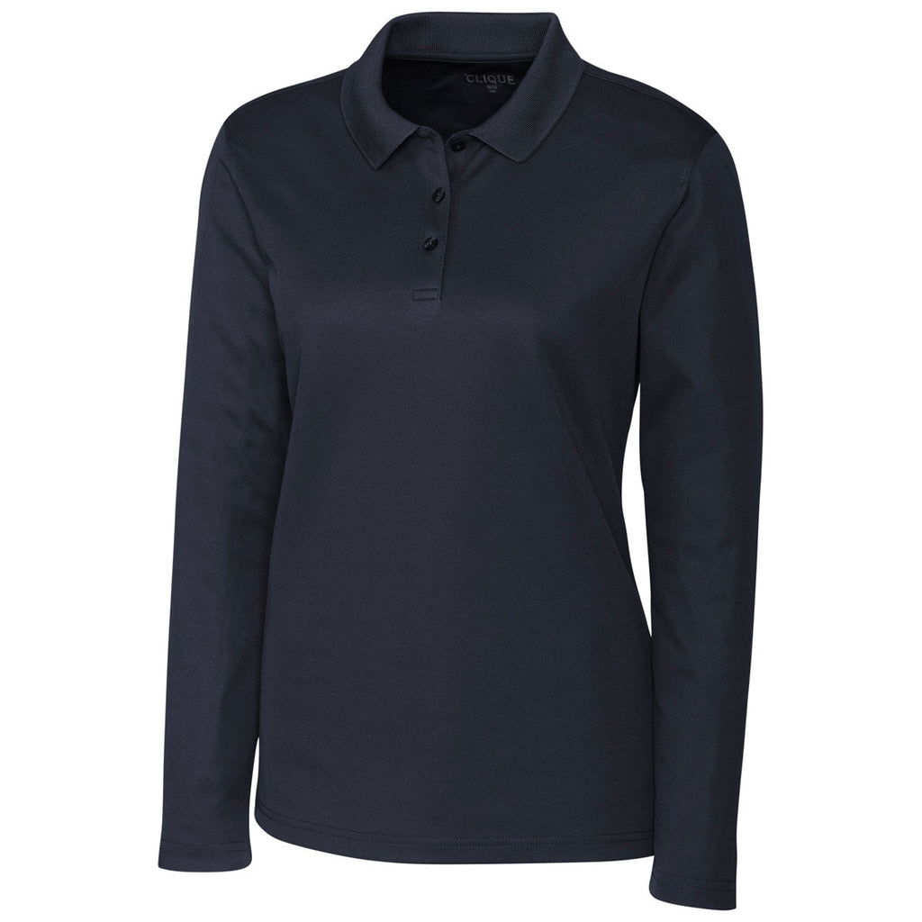 Usher in a new era of sleek women's apparel by ordering the Clique Women's Dark Navy Long Sleeve Spin Pique Polo. The long sleeve shirt is perfect as the outer layer of a golf fashion ensemble. You can also wear the body heat trapping pique polo under a plush sweater. Open the rib knit collar to create an upscale look. Enjoy a long lasting polo that contains 100% rip and tear resistant spin-dyed polyester pique. The full taped neck seam prevents the fabric from fraying because of frequent use. Attach a custom logo on the large area where you tore off the label.Corresponding Men's Style: Clique Men's Dark Navy Long Sleeve Spin Pique Polo