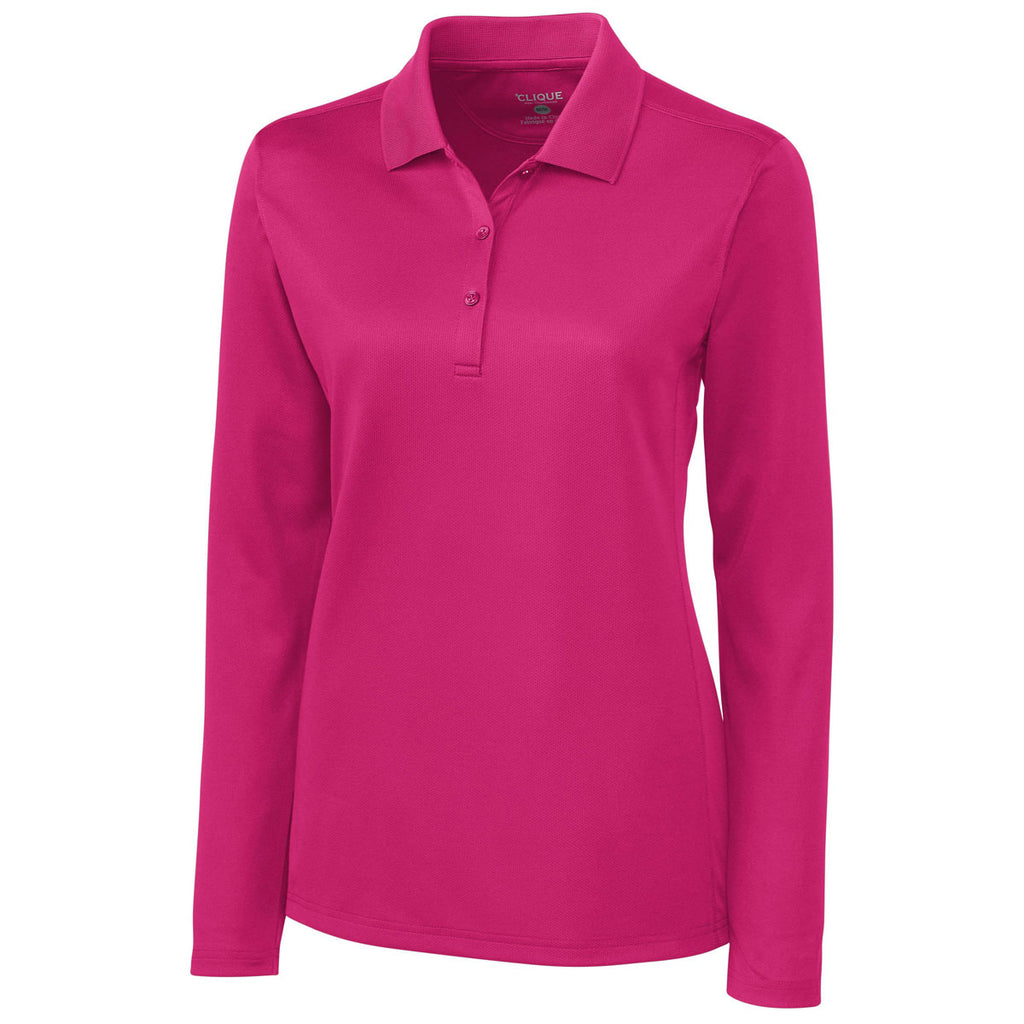 At the next industry sales conference, give away the corporate logoed Clique Women's Ribbon Pink Long Sleeve Ice Pique Polo to build credibility for your brand. The 100% polyester mesh polo includes an embroidery area for attaching your company logo. With a custom logo, you reach more customer prospects in the community. Polyester mesh allows the fabric to breathe, which makes the pique polo perfect to wear during corporate sponsored golf tournaments. Cover stitching at the front and back body seams resist rips and tears to deliver years of incredible fashion performance.Highlights