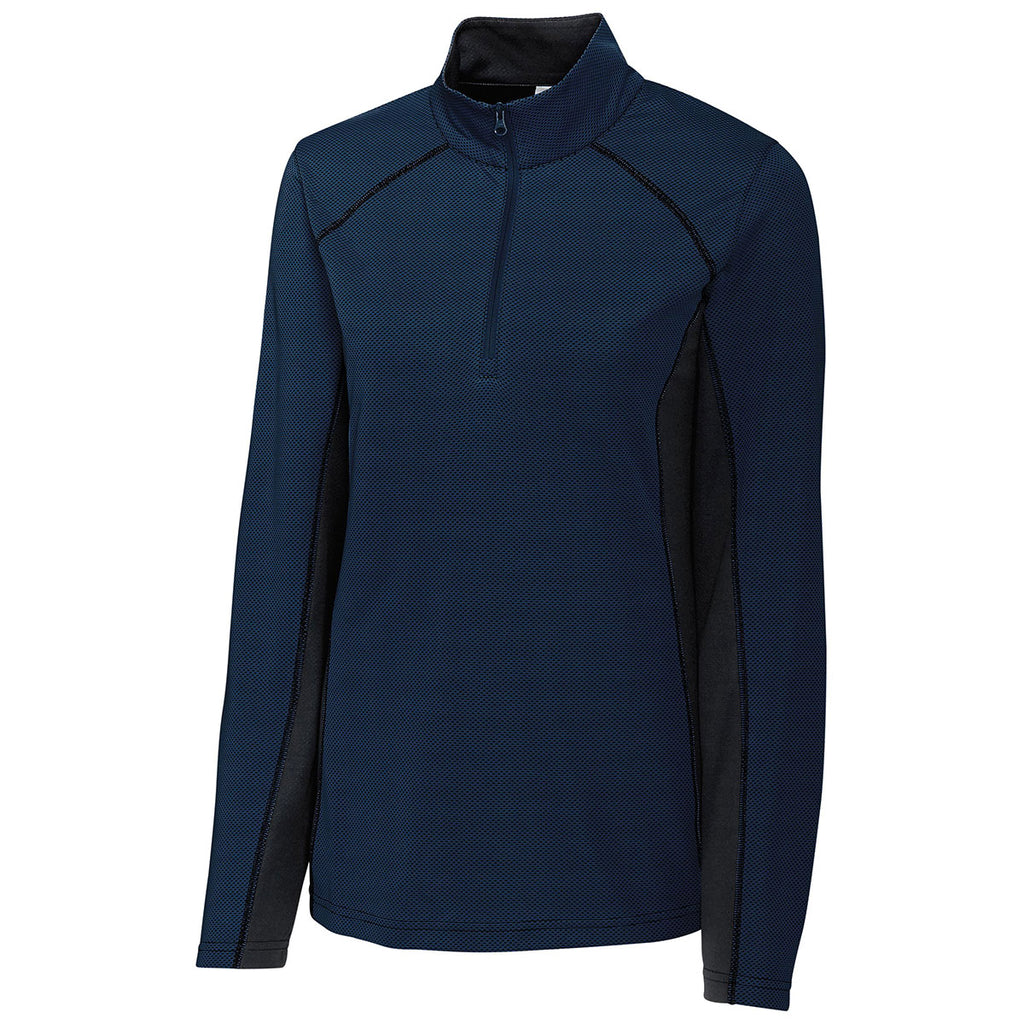 The Clique Women's Dark Navy Ice Colorblock Half Zip shirt is a stylish option for weekend wear or after a long day at the office. Add a custom logo to the front of the shirt in embroidery and you can get the word out on your company name with ease. Choose from a variety of eye-catching colors and enjoy included features such as a 100% polyester material, mock neck with half zip design, colorblock detail on the side panels, and much-appreciated moisture wicking fabric. This item is the perfect corporate apparel for employees and customers alike.Corresponding Men's Style:Cutter & Buck Men's Dark Navy Ice Colorblock Half Zip