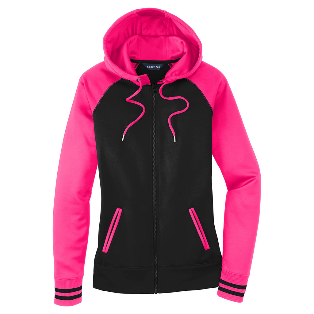 Try ignoring the weather outside one day and seeing how well you dress. Not such a great idea, was it? That's because the weather is by definition unpredictable; if you're going to want to be prepared, you're going to have to wear the jackets that separate you from mother nature. This Sport-Tek Women's Black/Neon Pink Sport-Wick Varsity Fleece Full-Zip Hooded Jacket is just what you need. Simply add your corporate logo to one of these pieces to make it a great embroidered piece of business apparel.Highlights