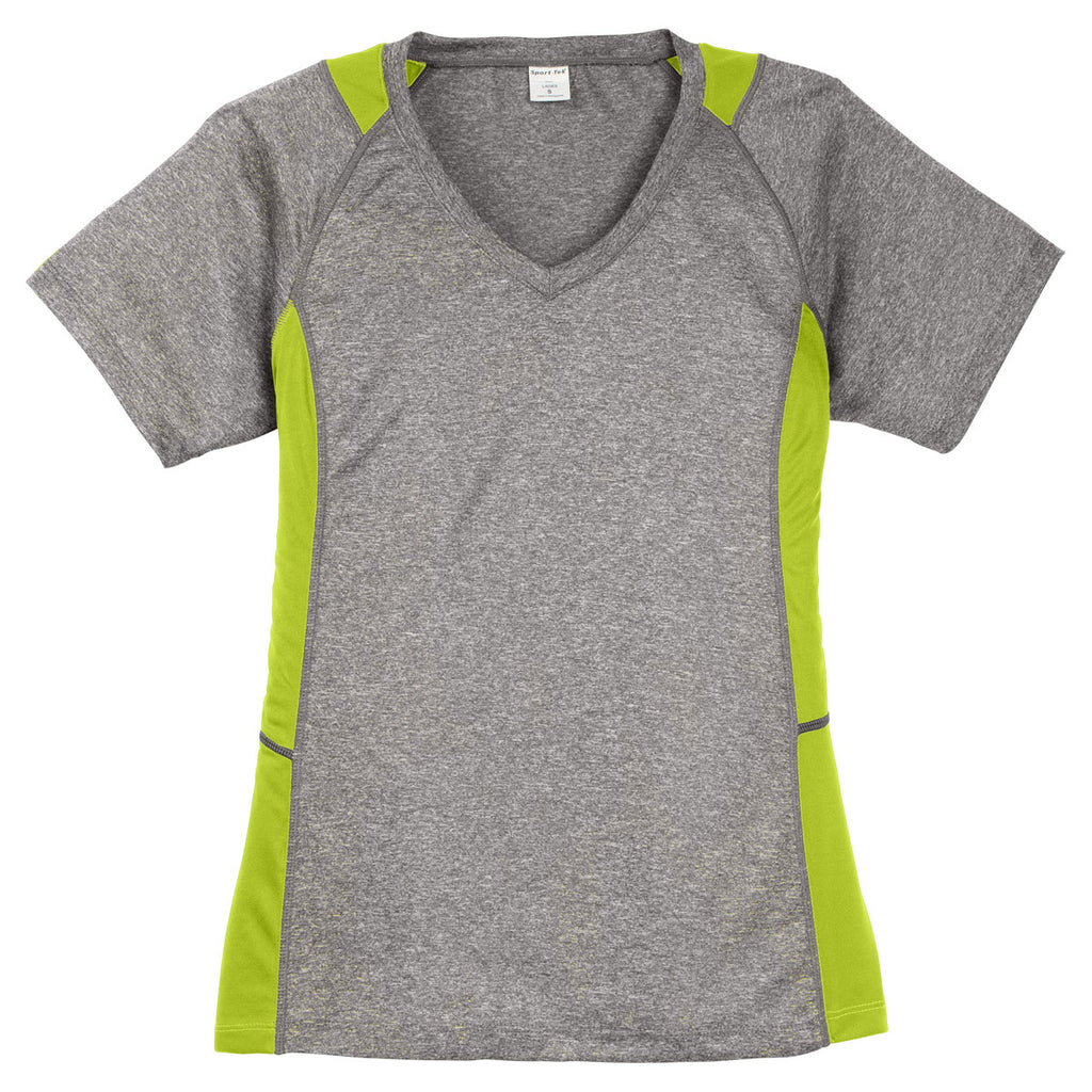 Be honest: if there was only one type of upper-body clothing you could bring to a desert island with you, it would be a T-shirt. And it'd probably look something like Sport-Tek Women's Vintage Heather/Lime Shock Heather Colorblock Contender V-Neck Tee. That's especially true for businesses who need to create some business apparel from items that will enhance their corporate brand.