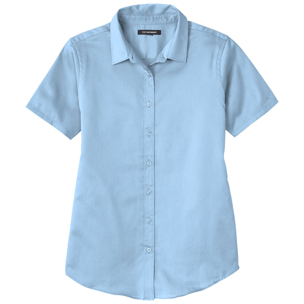 Sport a professional look with the custom embroidery Port Authority Women's Cloud Blue Short Sleeve SuperPro React Twill Shirt. This shirt not only offers a professional look that is perfect for corporate apparel, but is tough enough to stand up to a hard da work. The wrinkle-resistant shirt is soft and smooth for a polished look. Stain release paired with easy care means you can wear this daily without concern. Add a company logo to create community among employees with employee apparel or add a custom logo to include this in a logoed apparel line. The choice is yours.