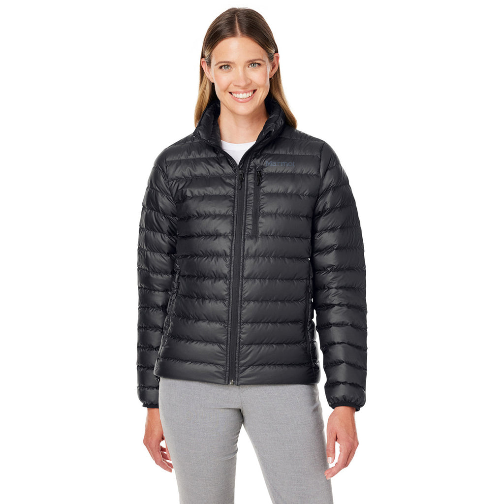 Marmot Women's Black Highlander Down Jacket with custom embroidery is a fun option for cold weather wear. The quilted look of the full zip jacket leaves you looking cold weather ready and the lightweight warmth provided is great no matter what your day may hold. A zippered chest pocket and hand warmer pockets are great for small items. Place your order.