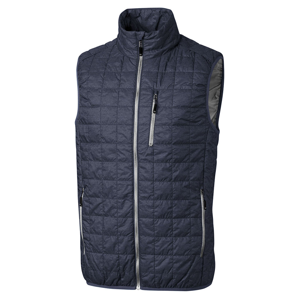 Quilted vests are in, and when you put your custom logo on this custom Cutter & Buck Men's Anthracite Melange Rainier Vest, everyone will know you are a company that keeps up with the times. It is insulted and made from easy-care taffeta. It has a mock turtle neck, full zipper front and front pockets with zippers. The wind will be kept at bay with the elastic bound armholes and hem. For your embroidered logo there is zip-in lining for embroidery access. There is Primaloft fill that is packable into the left front pocket. This custom vest is machine washable in cold water on the delicate cycle.Corresponding Women's Style: Cutter & Buck Women's Anthracite Melange Rainier Vest