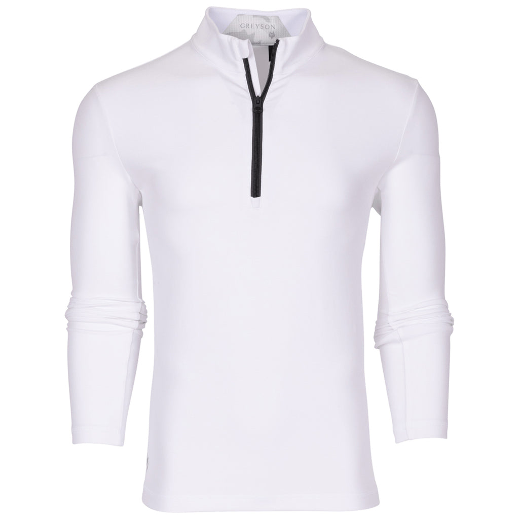 Greyson Men's Arctic White Sequoia 1/4 Zip with custom embroidery is a great and fashionable way to cuddle up or get active while still looking amazing. Constructed from Italian fabric, this windproof shell has an athletic fit great for the course, perfect for a morning run, or going about daily errands. Place an order today.