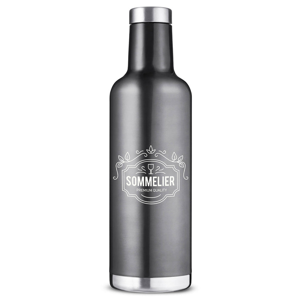 The Primeline Gunmetal 25 oz. Alsace Vacuum Insulated Wine Bottle is a beverage container with upscale appeal. For an employee appreciation gift or event giveaway item that will make your company's custom logo look impeccable, consider adding it to this vacuum insulated beverage container's stainless steel exterior.The minimum order for this product is 25 pieces.