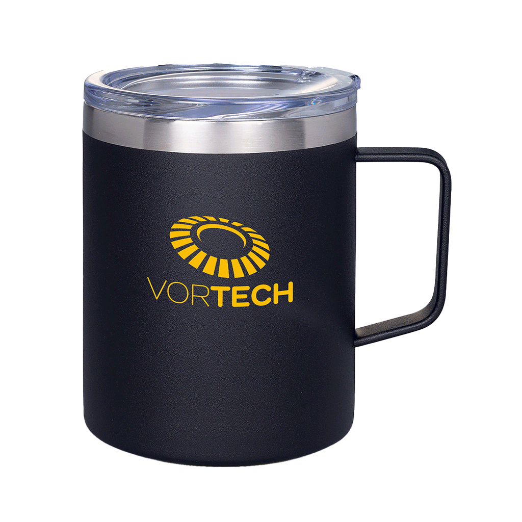The Primeline Black 12 oz. Vacuum Insulated Coffee Mug with Handle is the perfect way for your employees or audience members to take their morning coffee - and your company's custom logo - along with them when on the go. This contemporary mug also comes in a variety of bright, eye-catching colors.The minimum order for this product is 25 pieces.