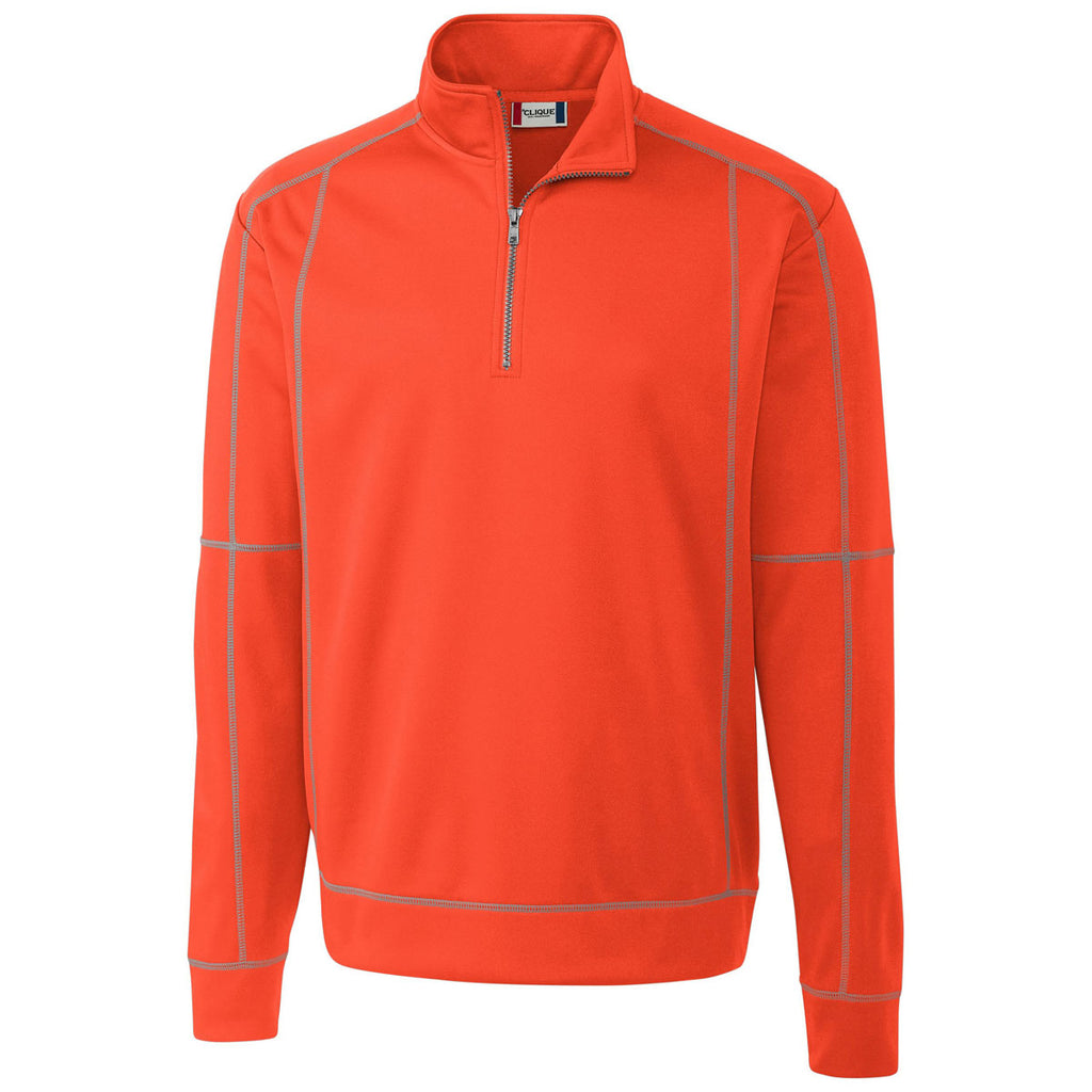 Put on company apparel for all social occasions by ordering the custom logoed Clique Men's Blood Orange Helsa Half Zip. Soft fleece lining feels smooth on the body and the exterior presents an attractive shiny appearance that gets you noticed at business seminars and conventions. Attach your corporate logo on the embroidery area to turn the attention into lifelong customers of your business. Moisture wicking technology ensures you remain comfortably dry throughout a daylong company sponsored golf tournament. Mock style neck complements the design of the smooth moving half zipper. Contrast stitching resists rips and tears to deliver years of high fashion performance.Highlights
