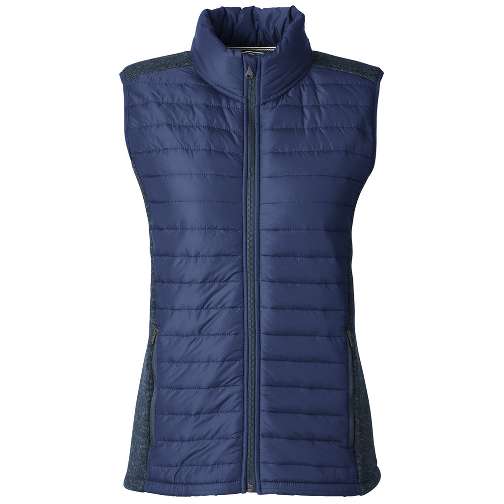 Choose embroidery for the Nautica Women's Nautical Navy/Nautical Navy Heather Harbor Puffer Vest to create an overall look that is ready for adventure. The puffer vest is fashion forward without being too bulky with heat-retaining properties and water-resistant qualities. Your corporate logo would turn this vest into an excellent employee gift or an addition to a logoed apparel line. Place an order today.