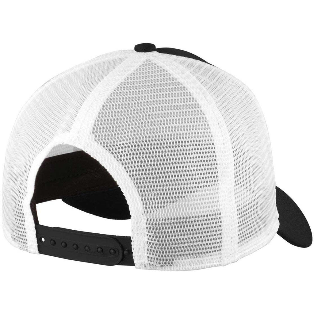 The panel custom embroidered New Era Black/White Snapback Mesh Back Trucker Cap offers superior ventilation to keep you cool under pressure on the baseball diamond or on the job. These personalized two-toned mesh back trucker hats feature a 7-position adjustable snapback closure, so they're true one-size-fits-all caps. That means they're perfect as promotional headwear when you add your team or company logo to the structured front of the hat! Perfect for your outdoorsy corporate logo or team logo, this custom trucker cap features 100% cotton twill front panels and 100% polyester mid and back panels for maximum comfort as well as protection from hot weather. The 7-position adjustable snap will ensure that it fits well every single time, offering you the most possible comfort even if you wear this cap all day long. And you probably will.