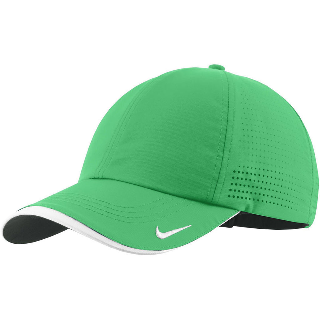 Spread your brand everywhere from the golf course to the office with a Nike Dri-FIT Lucky Green Swoosh Perforated Cap. These personalized Nike Golf Hats are made using Nike's signature Dri-FIT moisture-wicking polyester fabric, so your head will stay cool and dry all day long. Plus, the iconic Nike Swoosh logo is positioned both on the bill of the hat and on the back, leaving space front and center for your custom embroidered company logo. Simply put, these bright green Nike hats are the perfect corporate headwear for your business. Featuring a contrast underbill, striped edge and classic Nike Golf Swoosh trademark on the side, as well as laser-cut perforations on the back and side of the cap to keep you cool. The Nike Golf Dri-FIT Black Swoosh Perforated Cap features moisture management technology within the fabric that will keep the wearer cool under the hot sun or during stressful situations. An unstructured, low-profile design with hook and loop closure.