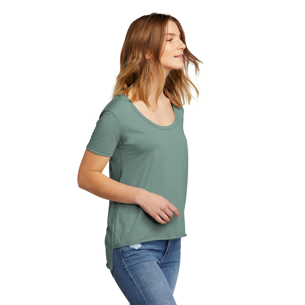 Amp up your tee collection with a custom Next Level Women's Stonewash Green Festival Scoop Neck Tee. This takes the simple tee to the nest level with a scoop neck cut that provides flair. Add a company logo to use this as employee apparel or for some special employee event used for team or company building. Try out a custom logo to use for a team, organization, club, or just to add to your own wardrobe. The poly and ring spun cotton blend is soft, comfortable, and wearable with rib knit scoop neck and a relaxed fit. The raw edge creates an exaggerated drop tail hem for extra coverage.Highlights