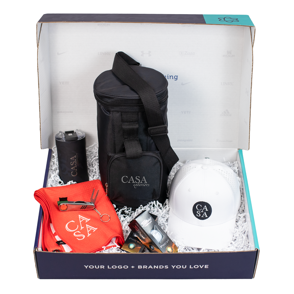 Step up your game with this corporate golf gift set! Show off your brand and block out the sun with the UNRL Mid-Pro Vented Snapback. Your drinks will stay cool for 18 holes with the BruMate Hopsulator Trio and the Koozie Golf Back Nine Kooler. Store the Slowtide Links Golf Towel, Good Value Golf Tool Keyholder, and Titleist Pro V1 Golf Balls in your golf bag so you can keep the game going all day long!