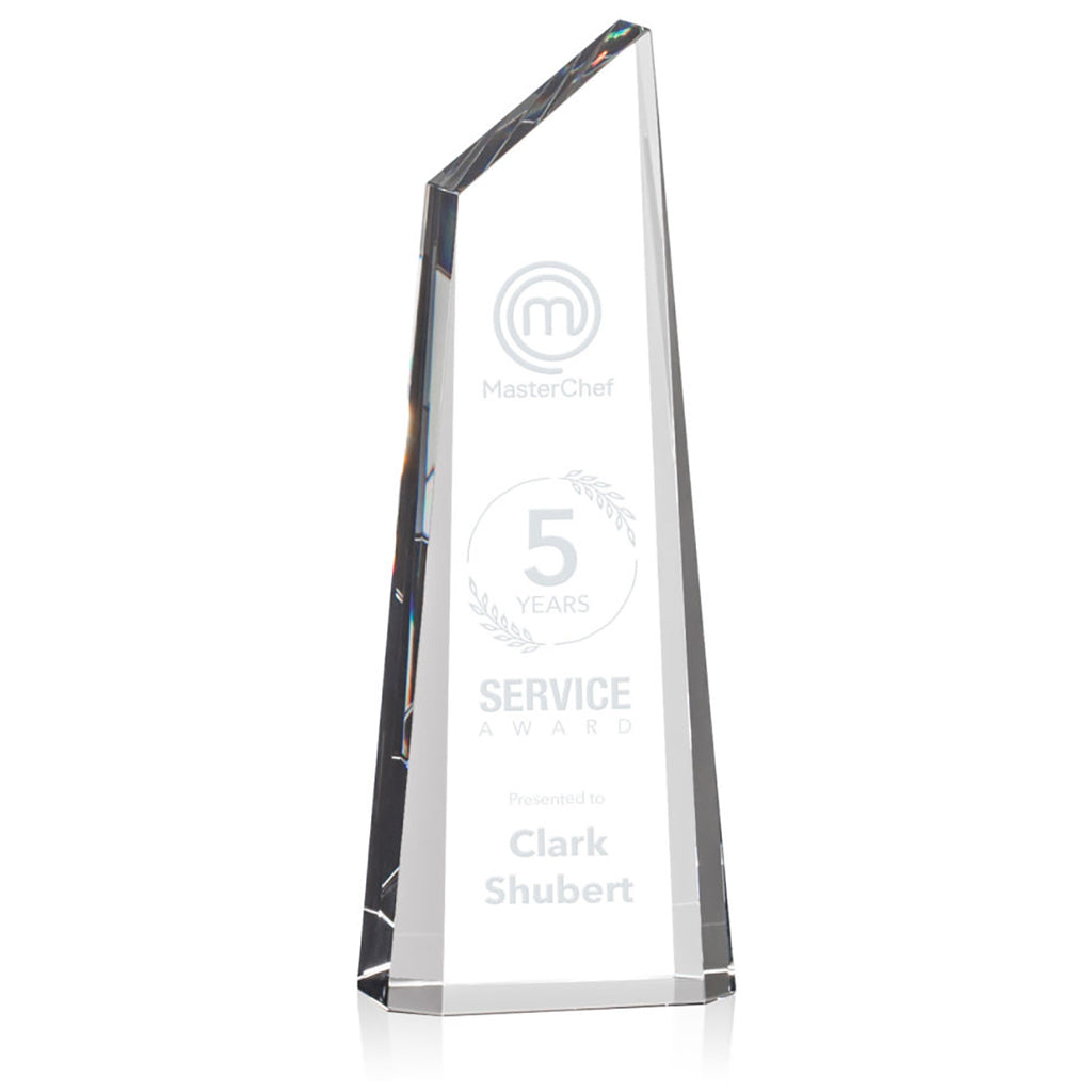 Create a custom message for the St. Regis Clear Akron Tower Award 3" x 8" x 1.75" without Base - Laser Engraved to give an award that is as special as the recipient. This trapezoidal tower is anchored with a thick optical crystal bottom that tapers to a peak to create an eye-catching design. Perfect for companies, services awards, or sporting championships.