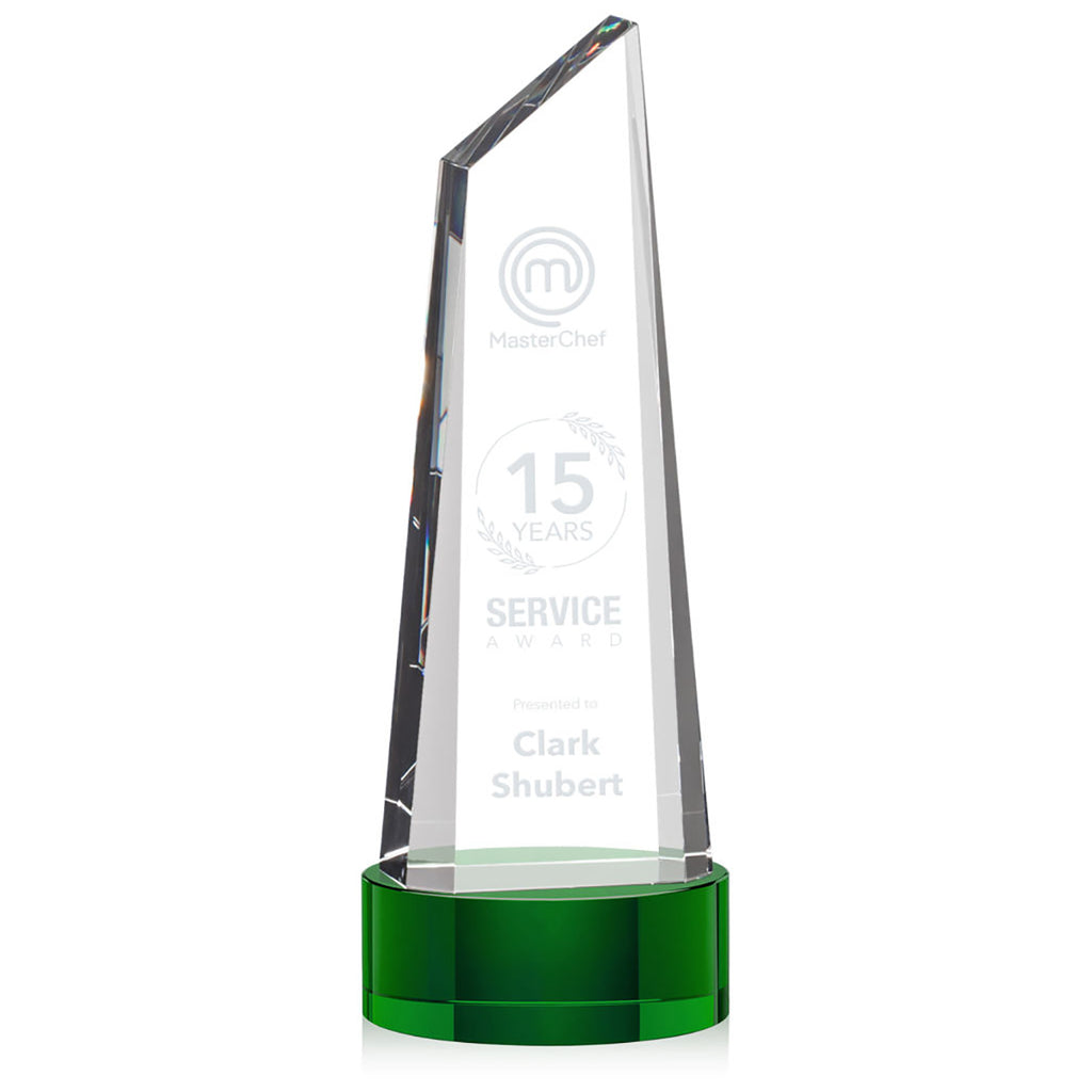 Create a custom message for the St. Regis Green Akron Tower Award 5" x 14" x 5" with Base - Laser Engraved to give an award that is as special as the recipient. This trapezoidal tower is anchored with a thick optical crystal bottom that tapers to a peak to create an eye-catching design. Perfect for companies, services awards, or sporting championships.The minimum order for this product is 1 piece.