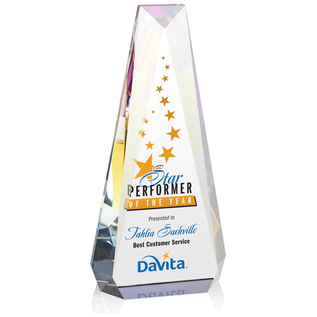 • The multi-color base reflects a brilliant rainbow of colors throughout the dynamic bevels of the award.