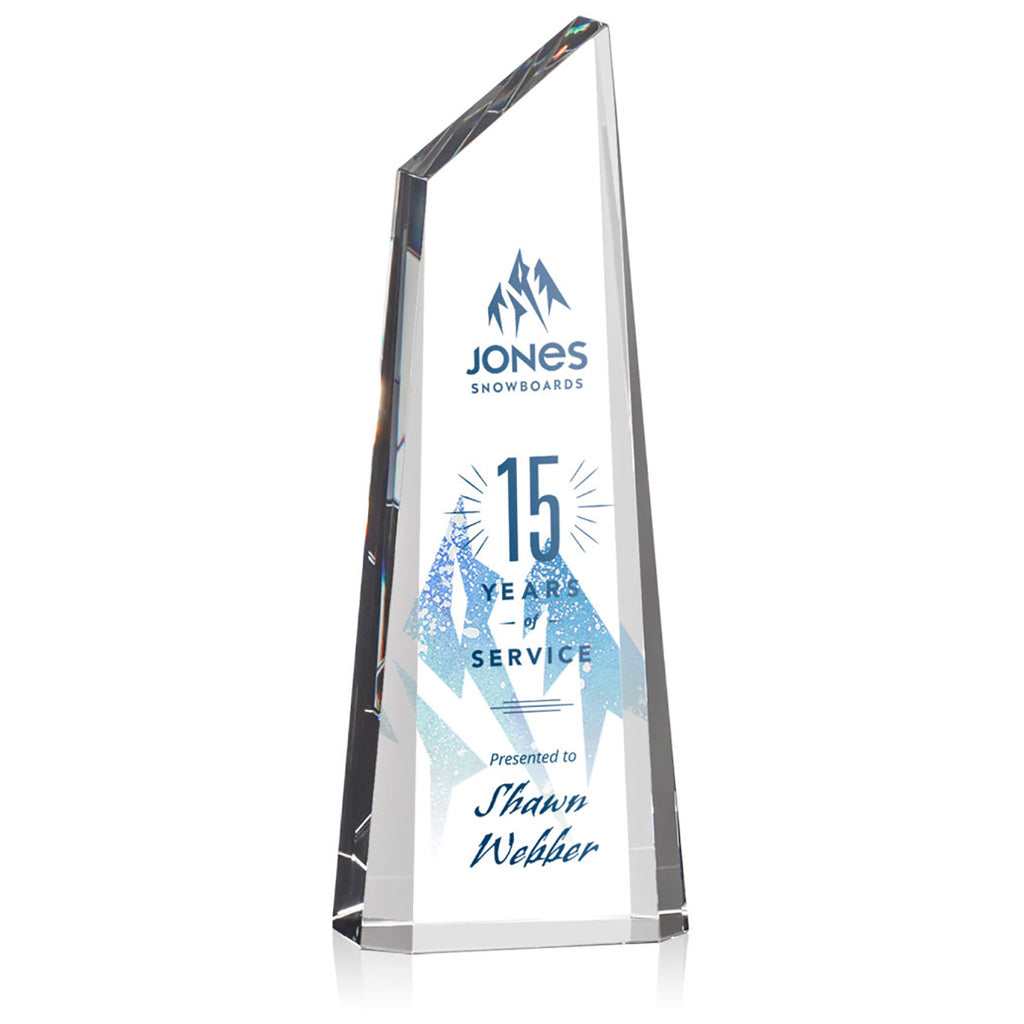 - Stunning trapezoidal tower award is anchored with a thick optical crystal bottom that tapers to a peak.
