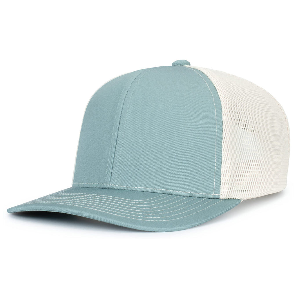 Add your corporate logo to the Pacific Headwear Smoke Blue/Beige/Smoke BlueContrast Stitch Trucker Pacflex Snapback Cap for a fun and simple way to showcase your brand. The iconic trucker cap is a one-size-fits-most adjustable design with mesh backing, a mid-profile, and a curved visor that is easy to wear and share, whether at a trade show, special event, or to increase customer relations. Order today.Highlights