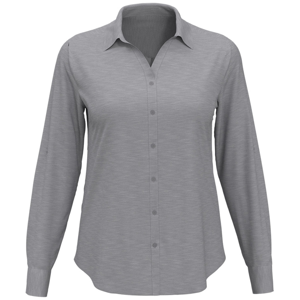 Add embroidery to the Perry Ellis Women's Quiet Shade Heathered Woven Shirt for a fun and flirty work that can be dressed up or down as needed. The button-up V-neck has a feminine fit with sleeves that can be converted to 3/4 with ease. Ideal for work, hanging out, or a fun night with friends. Place an order today.Corresponding Men's Style: Perry Ellis Men's Quiet Shade Heathered Woven Shirt