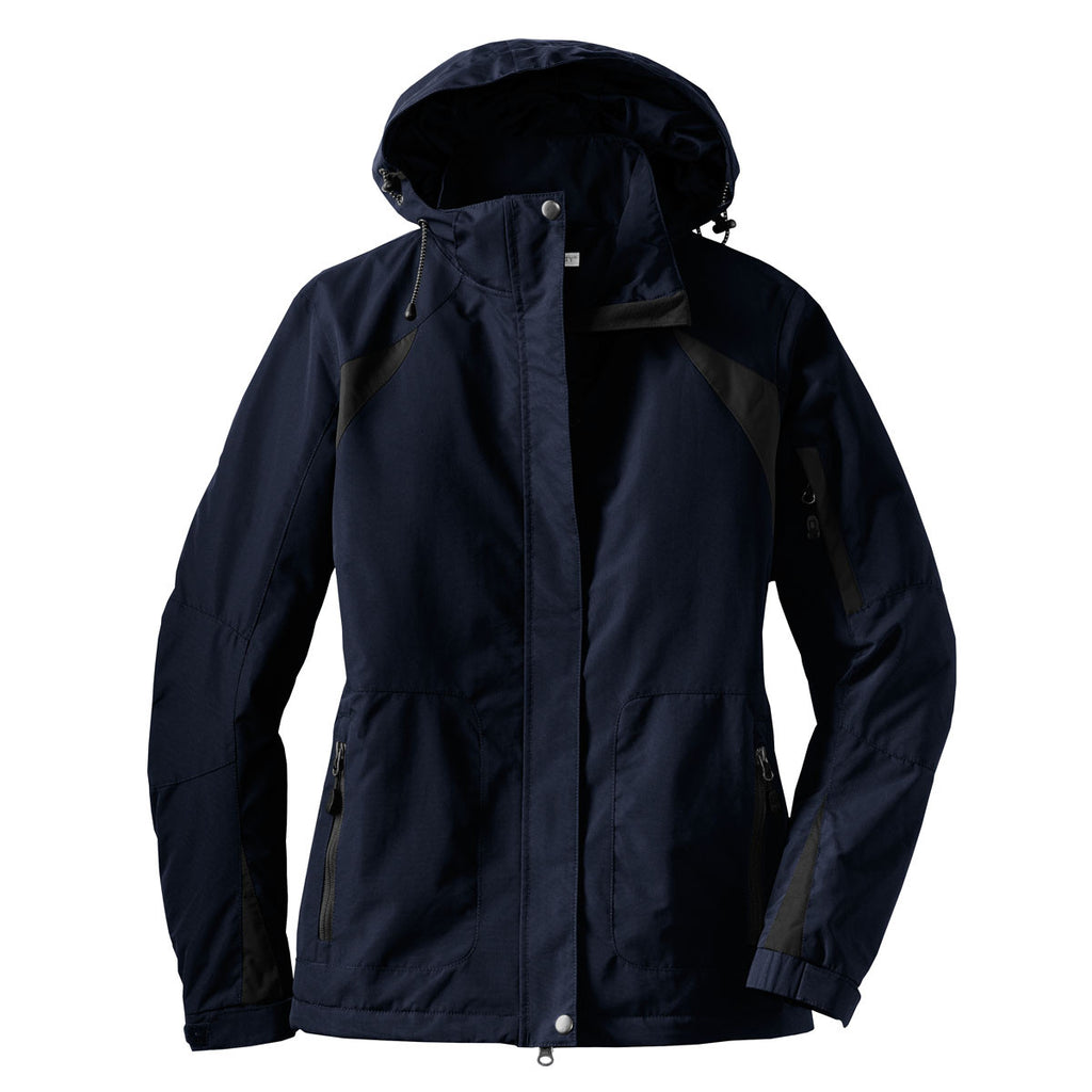 Rainy days? What rainy days? You don't have to let the weather dictate your mood so long as you have a jacket that keeps the weather conveniently off your skin. If that's what you're looking for, allow us to introduce you to the Port Authority Women's True Navy/Iron Grey All Season II Jacket. This jacket is ready for a battle with the weather, featuring a 100% Taslan nylon shell and 100% polyester sleeve lining that makes it easy to put on and take off. The 3000MM fabric waterproof rating is a fancy number that basically says, this jacket will keep you dry. If you want to keep your employees dry in the rainy season, add your own company logo to this jacket and make them a uniform they'll be proud and comfortable to wear.Corresponding Men's Style: Port Authority Men's True Navy/Iron Grey All Season II Jacket