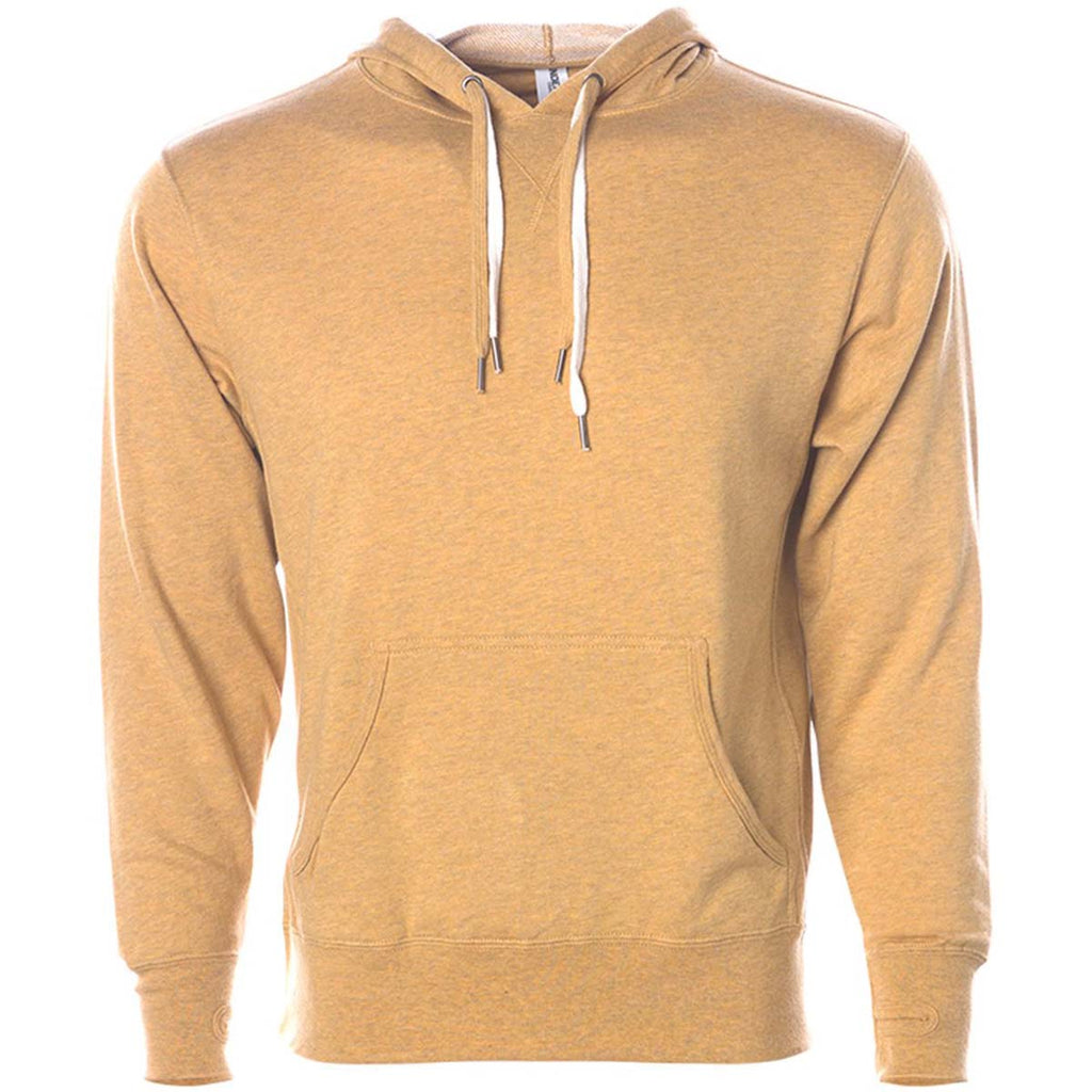 Invent a custom look with the Independent Trading Co. Unisex Golden Wheat Heather Midweight French Terry Hooded Pullover Sweatshirt with custom logo. Your company colors or design will stand out on one of the many available colors of this athleisure wear that will be a huge hit. The cotton polyester blend French terry is both soft and comfortable with an unlined hood, double needle sewing, thumbholes at the cuffs, and a V notch at the neck. Perfect for a quick workout or hanging out with friends on the weekend. Add a heat transfer to these pullovers and offer as employee gifts for nearly any occasion. Wait no longer, place an order today!Highlights