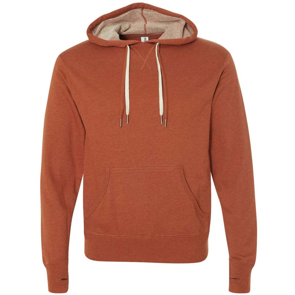 Invent a custom look with the Independent Trading Co. Unisex Burnt Orange Heather Midweight French Terry Hooded Pullover Sweatshirt with custom logo. Your company colors or design will stand out on one of the many available colors of this athleisure wear that will be a huge hit. The cotton polyester blend French terry is both soft and comfortable with an unlined hood, double needle sewing, thumbholes at the cuffs, and a V notch at the neck. Perfect for a quick workout or hanging out with friends on the weekend. Add a heat transfer to these pullovers and offer as employee gifts for nearly any occasion. Wait no longer, place an order today!