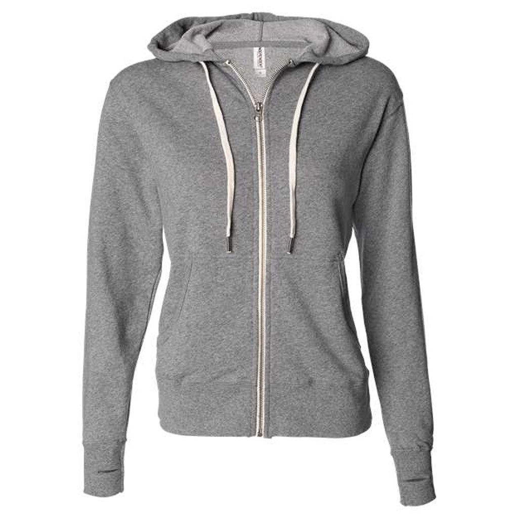 Invent a custom look with the Independent Trading Co. Salt Pepper Heathered French Terry Full-Zip Hooded Sweatshirt with custom logo. Your company colors or design will stand out on one of the many available colors of this athleisure wear that will be a huge hit. The cotton polyester blend French terry is both soft and comfortable with an unlined hood, double needle sewing, thumbholes at the cuffs, and a V notch at the neck. Perfect for a quick workout or hanging out with friends on the weekend. Add a heat transfer to these pullovers and offer as employee gifts for nearly any occasion. Wait no longer, place an order today!Highlights