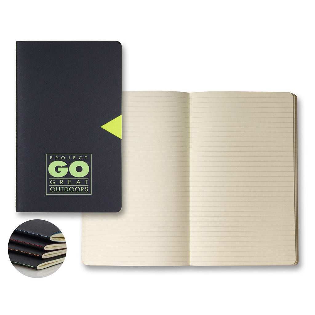 Encased in a black notched cover, Medium Ivory Notch Journal contains 80 grey-lined pages. Comes with matching saddle stitching on the spine. This stylish journal is foil imprinted with a custom logo of brand or company to leave a lasting impression as giveaway gift on corporate events and meetings.
