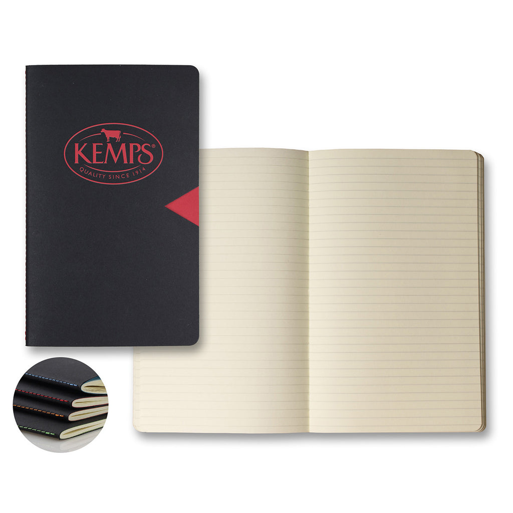 Encased in a black notched cover, Medium Ivory Notch Journal contains 80 grey-lined pages. Comes with matching saddle stitching on the spine. This stylish journal is foil imprinted with a custom logo of brand or company to leave a lasting impression as giveaway gift on corporate events and meetings.
