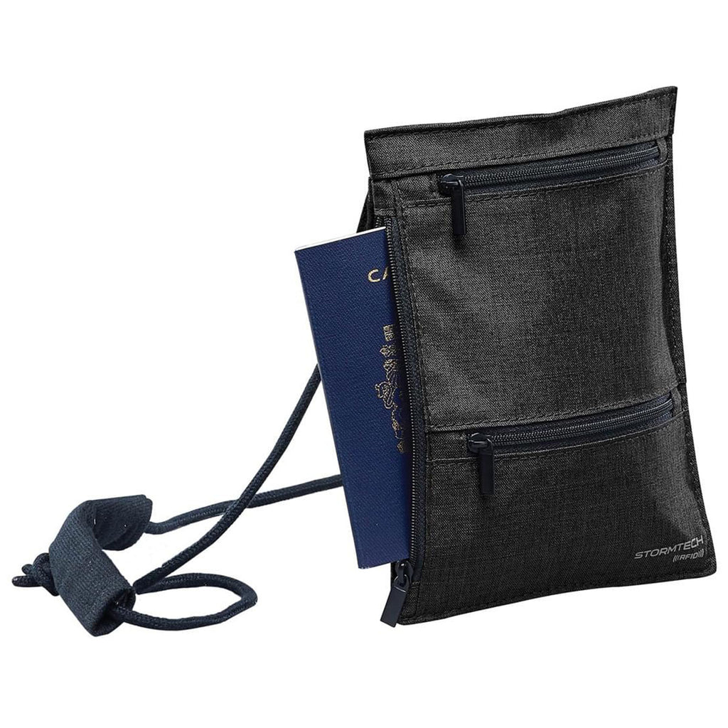 If your team members are always on the go, provide them with a convenient Stormtech Black/Black Cupertino RFID Passport Sling that features your company's custom logo or design. It's made from a special RFID blocking fabric to protect your information, while features like multiple zippered compartments and a long strap make it incredibly portable.